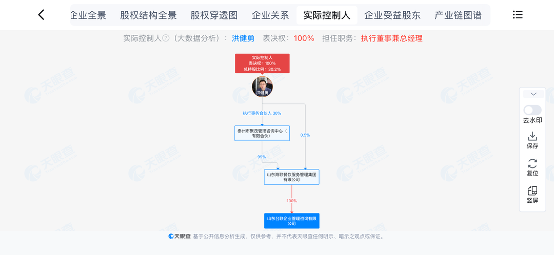 股权结构方面,国家企业信用信息公示系统显示,阿水大杯茶运营主体山东台联由山东海联餐饮服务管理集团有限公司100%控股,后者由泰州市聚茂管理咨询中心(有限合伙)、洪健勇、王丹红共同持股;泰州市聚茂管理咨询中心(有限合伙)的合伙人为洪健勇、王丹红。天眼查股权穿透显示,山东台联实控人为洪健勇。