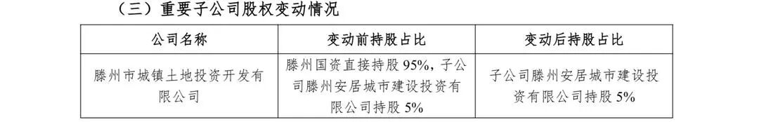 股权结构变动方面,本次划转前,滕州国资公司直接持有滕州土地投资95%股权,其旗下子公司滕州安居城市建设投资有限公司持有剩余5%股权;本次无偿划转完成后,滕州国资公司将不再直接持有滕州土地投资的股权。