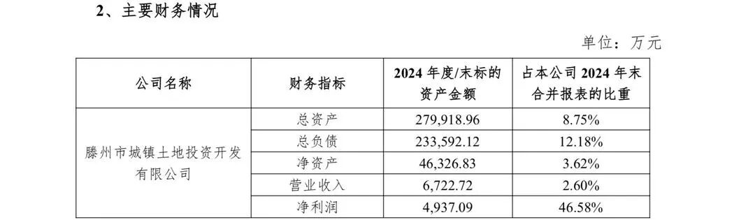 财务数据显示,滕州土地投资2024年度实现营业收入6722.72万元,实现净利润4937.09万元。截至2024年末,滕州土地投资总资产为279918.96万元,净资产为46326.83万元。