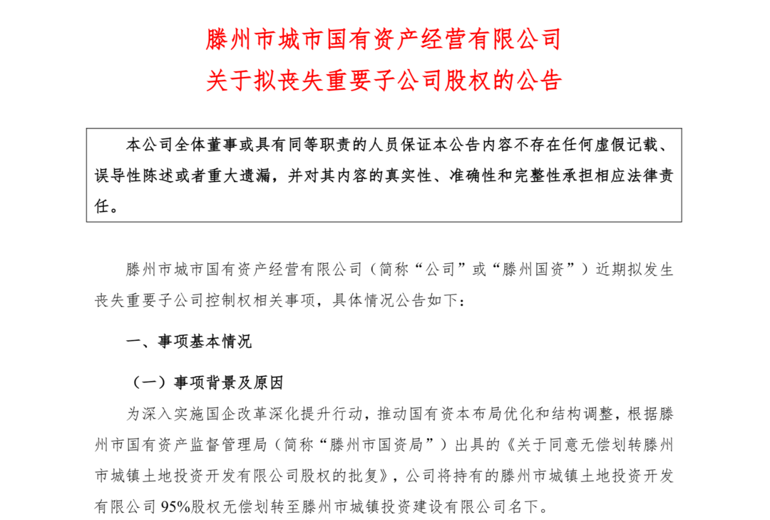 4月2日,滕州市城市国有资产经营有限公司(下称“滕州国资公司”)公告称,为深入实施国企改革深化提升行动,推动国有资本布局优化和结构调整,根据滕州市国有资产监督管理局出具的相关批复,公司将持有的滕州市城镇土地投资开发有限公司(下称“滕州土地投资”)95%股权无偿划转至滕州市城镇投资建设有限公司名下。