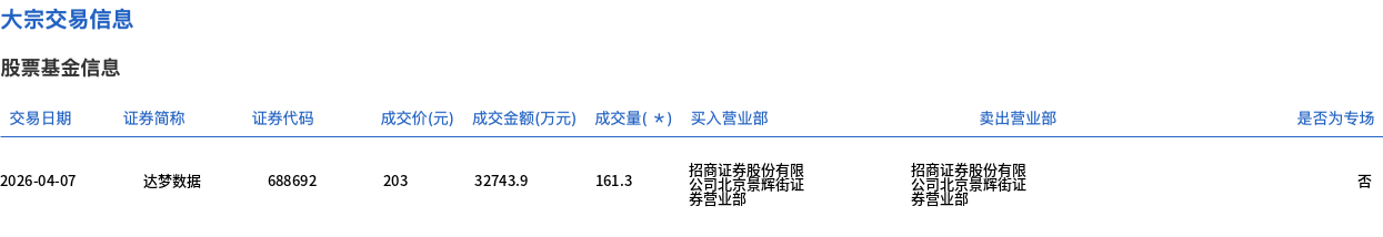 4月7日,达梦数据大宗交易成交161.3万股,成交额3.27亿元,占当日总成交额的65.89%,成交价203元,较市场收盘价214.16元折价5.21%。