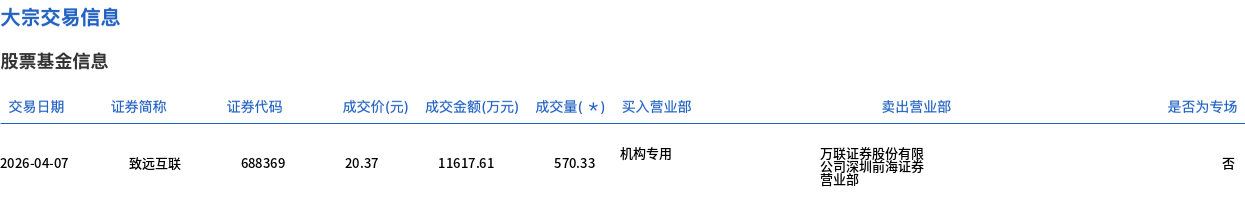 4月7日,致远互联大宗交易成交570.33万股,成交额1.16亿元,占当日总成交额的48.48%,成交价20.37元,较市场收盘价22.61元折价9.91%。
