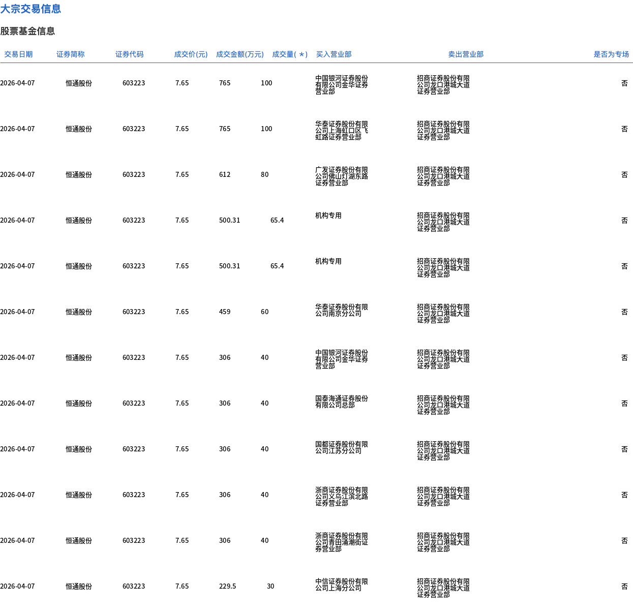 4月7日,恒通股份大宗交易成交700.8万股,成交额5361.12万元,占当日总成交额的48.9%,成交价7.65元,较市场收盘价8.5元折价10%。