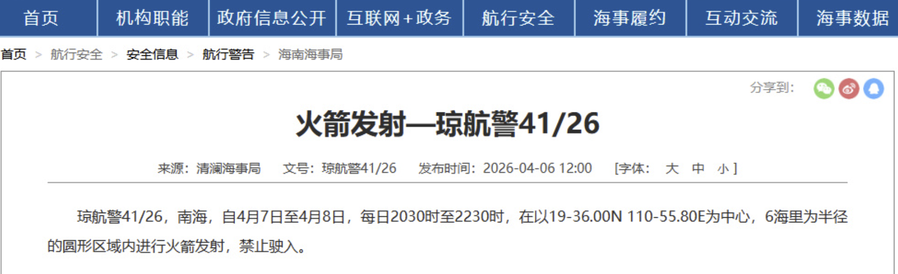 据中国海事局网站消息,清澜海事局发布航行警告,4月7日至4月8日,每日20点30分至22点30分,南海部分海域进行火箭发射,禁止驶入。
