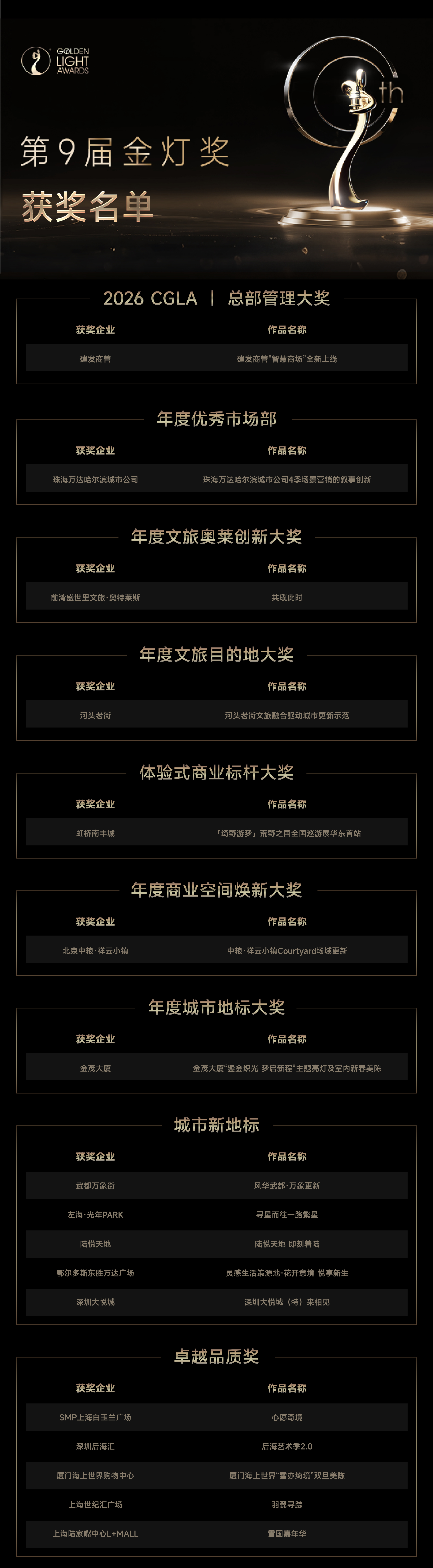 2026CGLA第九届金灯盛典的璀璨启幕,不仅是一场年度荣耀的加冕,更清晰标志着一个“文、商、旅、体”深度融合的大场景时代全面来临。金灯奖历经九年,沉淀了超过三千二百多件作品,生动记录了中国商业空间从功能载体向情感载体的深刻进化。