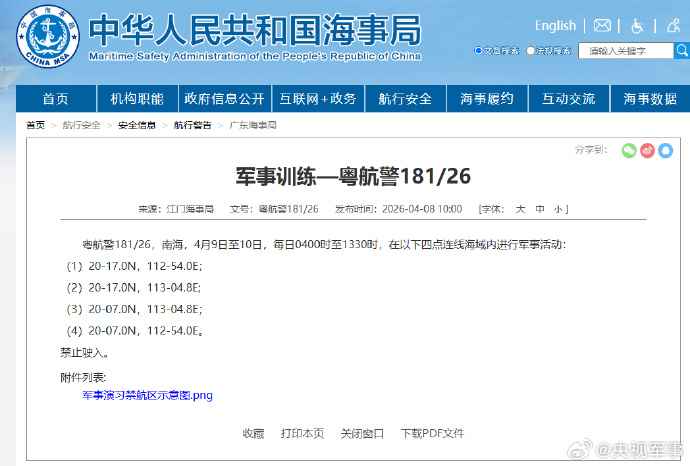 据中国海事局网站消息,江门海事局发布航行警告,4月9日至10日,每日4时至13时30分,南海部分海域进行军事活动,禁止驶入。