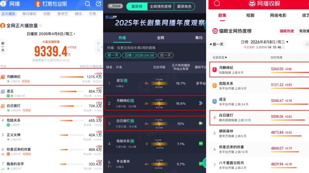 另一边,《白日提灯》虽也已获得云合S+评级,但截至发稿,其最高市占率仅10.8%。不仅如此,在猫眼剧集全网热度榜与灯塔剧集全网正片播放量榜上,其也同样遭到了《月鳞绮纪》的连续压制。