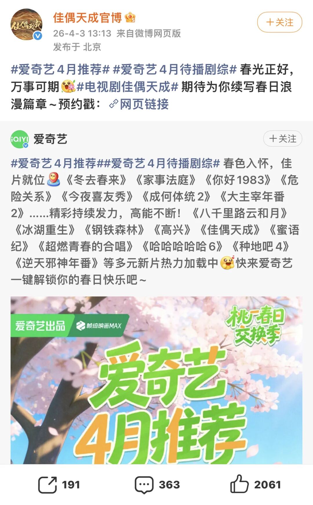 也就是说,爱奇艺虽将《佳偶天成》分销给腾讯视频,却依旧牢牢掌握着宣发主导权与平台主体性,双方看似联播,实则仍在流量与话语权上暗自较劲。