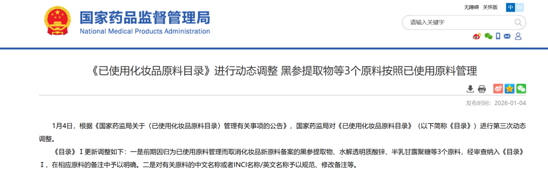对此,国家药监局明确表示将加强备案后检查,并严格审核原料的“新”属性。今年1月,黑参提取物、水解透明质酸锌、半乳甘露聚糖等3个原料移入《已使用化妆品原料目录》。