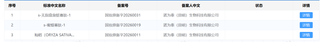维琪科技并未在本季度完成新原料备案,但贝泰妮成功备案了海菜花(OTTELIA ACUMINATA)提取物、α-丁酮酸钠两款新原料,其旗下专注于生物技术创新的企业诺为泰(昆明)生物科技有限公司则一口气备案了3款新原料:籼稻(ORYZA SATIVA SUBSP. INDICA)米提取物、s-蜜蜂寡肽-1、s-无指盘臭蛙寡肽-1。