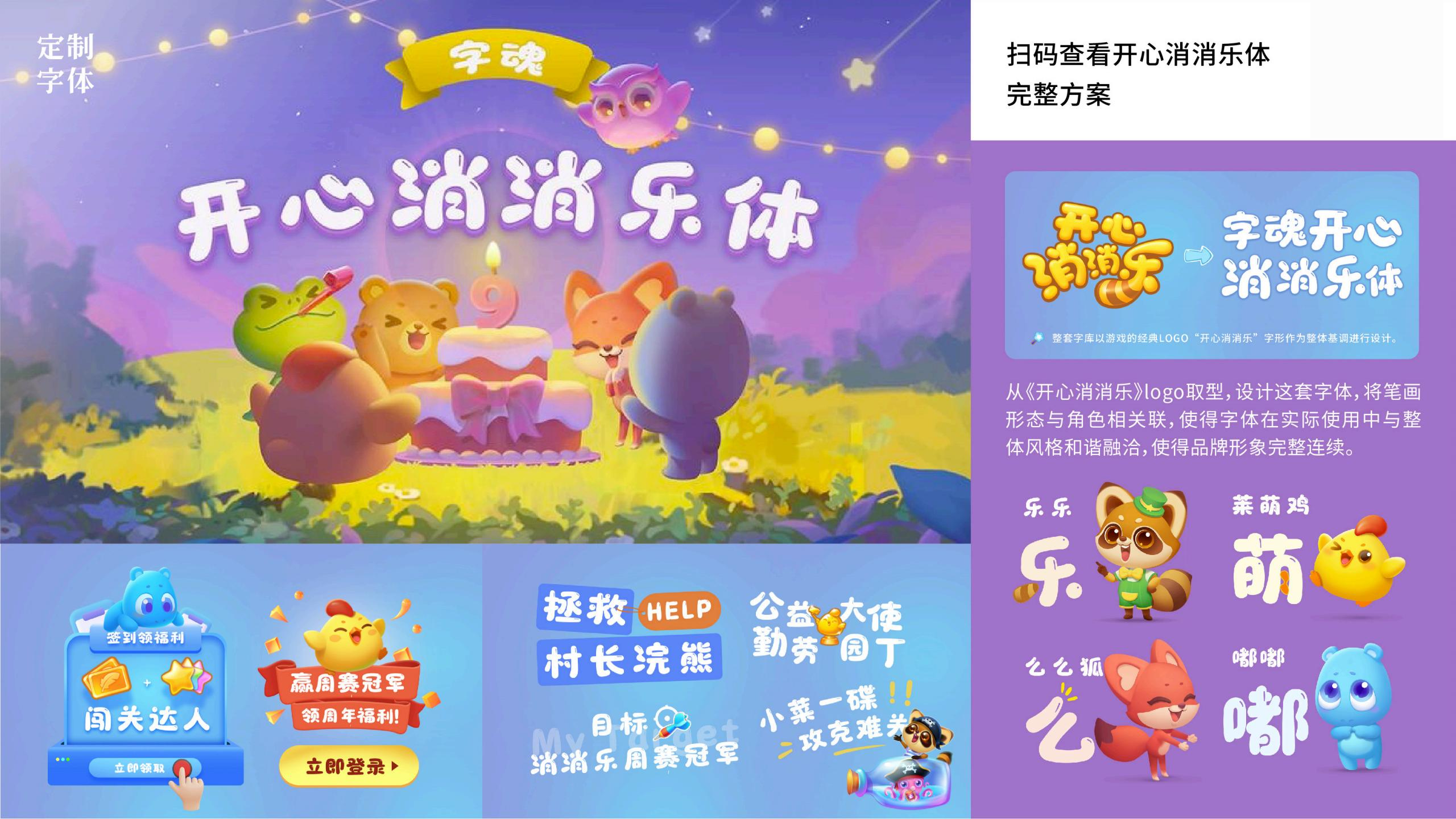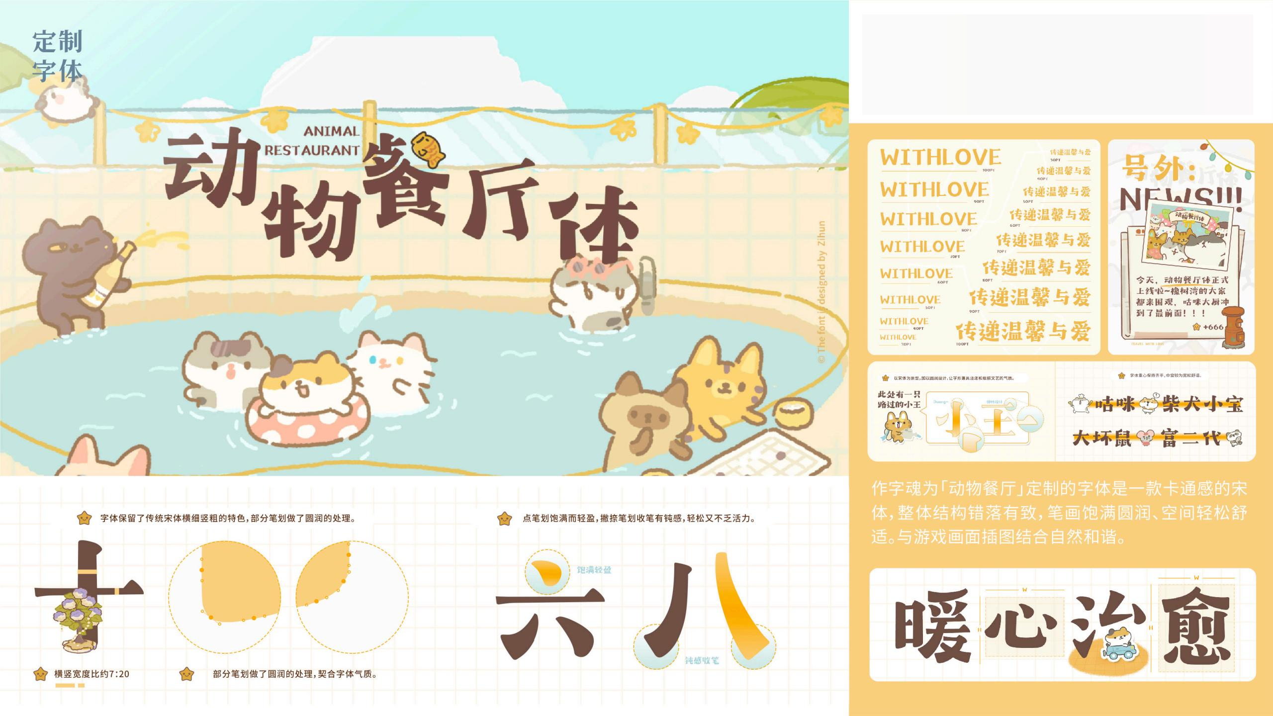 其为国民游戏《开心消消乐》打造的定制字体,以品牌LOGO字形为基础,将游戏极具辨识度的妙趣风格进行设计层面的规范化、深度化、灵动化,让轻快欢乐、松弛休闲的视觉效果跃然“屏”上。而该字体案例也获有2022-2023成功设计大奖,影响力突破游戏圈层触及多元行业领域。其为《仙剑奇侠传》打造的“字魂仙剑奇侠体”,回应了10亿网友的青春,为一代流行文化的经典IP赋予了新的表达载体;在轻量化的游戏中,字魂为经营类手游《动物餐厅》设计的定制字体,则收获了广大粉丝圈层的喜爱。