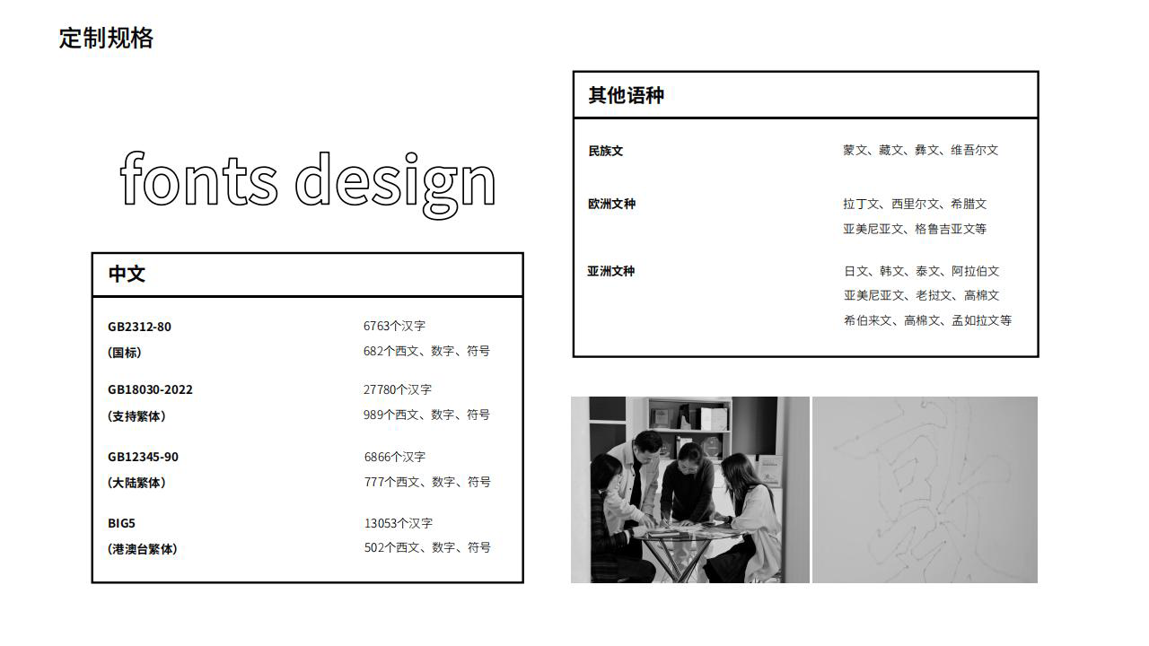 目前,字魂支持提供涵盖品牌字体、家族及可变字体、LOGO字体、特定场景小字库、多语种匹配等在内的多元灵活的专业字体设计定制服务。服务范围包含涵盖中文、西文、拉丁文、日文、韩文等超16种语种,和GB2312-80简体(6763个汉字+682个西文、数字、符号)、GBK、BIG5等不同国家标准,并已为文旅、影视、金融、潮流领域的35+品牌、机构和IP打造过成功定制案例。