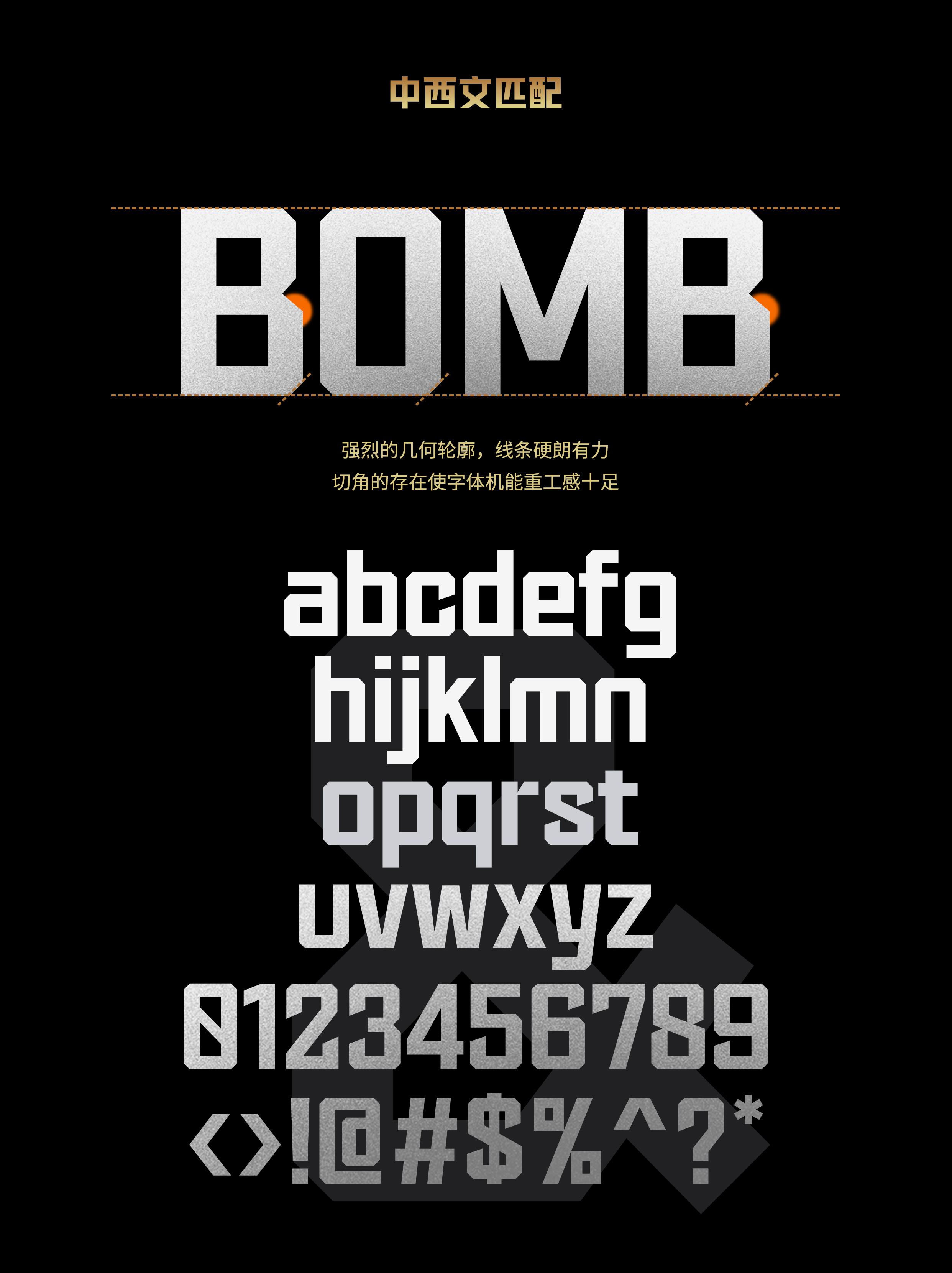 字魂为《穿越火线》量身打造的定制字体,以工业黑体为骨架,融军事风、科技感与竞技精神于一体,高度契合硬核、热血的战场氛围。设计上,字形方正硬朗,在简洁中迸发力量,在秩序中展现锋芒,十分呼应游戏“刚毅、果决、迅捷”的战场美学。