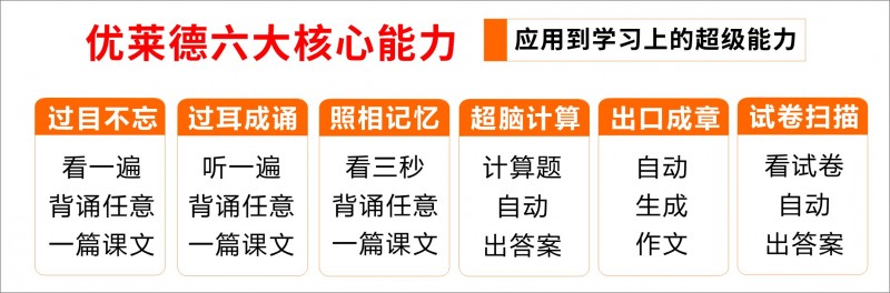 据张槿璇介绍,优莱德六大能力是:过目不忘能力,读一遍即背诵;过耳成诵能力,听一遍即背诵;照相记忆能力,也就是撒贝宁拥有的能力,看3秒钟,即可背诵一篇课文或者古诗等,这三个记忆能力解决了学生背诵的问题;第四大能力是超脑计算,学过计算逻辑后,计算题自动出答案,解决了计算题问题;第五大能力是出口成章,像AI一样,可以自动生成一篇作文,解决了学生写作的问题;第六大能力是试卷扫描能力,只需把试卷用眼睛扫描一遍,自动出答案,这个能力解决了学生考试答题的问题,六大能力覆盖背诵、计算题、作文和考试答题四大应用领域,无死角覆盖语数英理化史地政生等全学科。