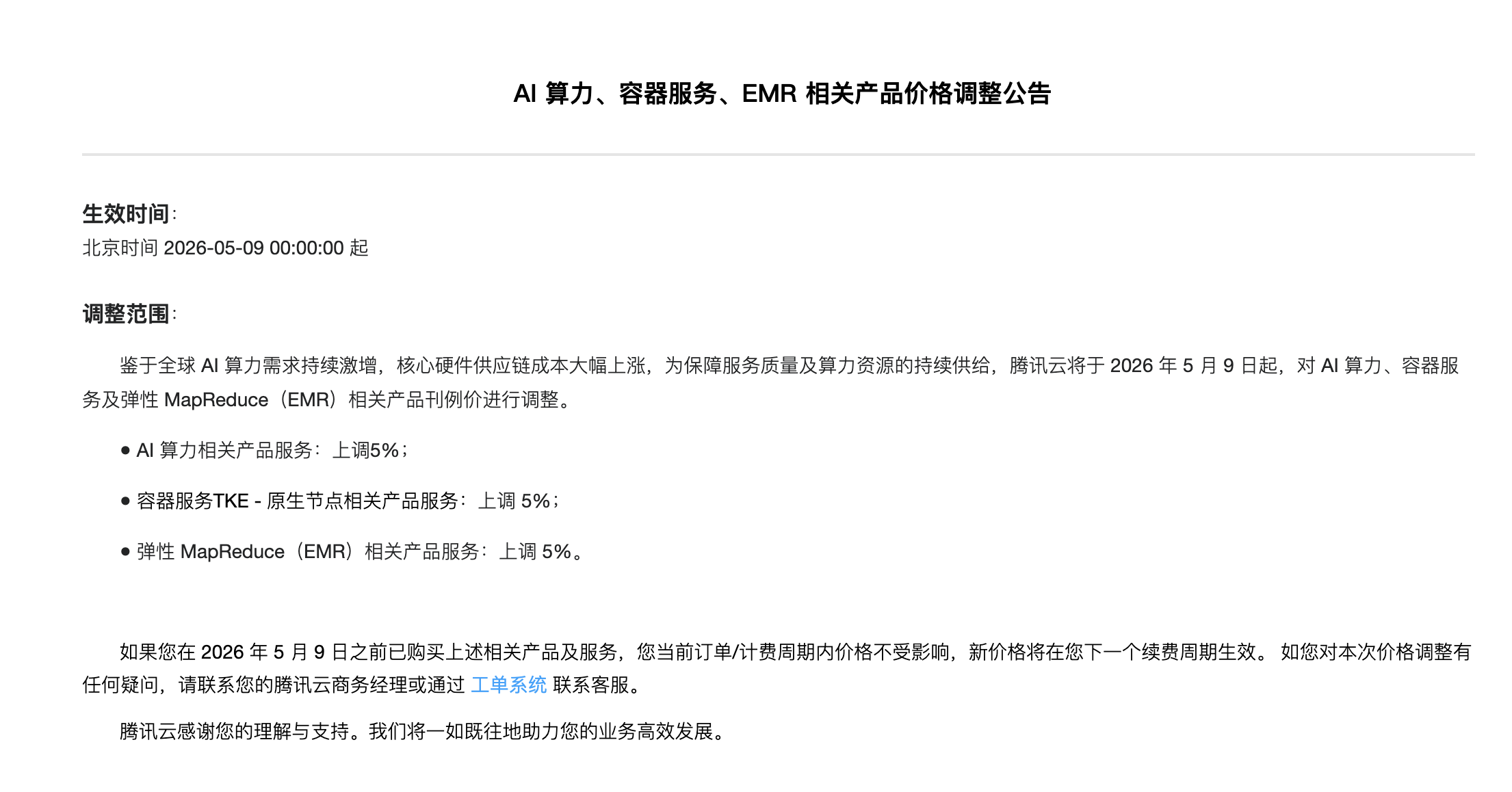 4月9日,腾讯云发布AI算力、容器服务、EMR相关产品价格调整公告,鉴于全球AI算力需求持续激增,核心硬件供应链成本大幅上涨,为保障服务质量及算力资源的持续供给,腾讯云将于2026年5月9日起,对AI算力、容器服务及弹性MapReduce(EMR)相关产品刊例价进行调整。AI算力相关产品服务:上调5%;容器服务TKE-原生节点相关产品服务:上调5%;弹性MapReduce(EMR)相关产品服务:上调5%。