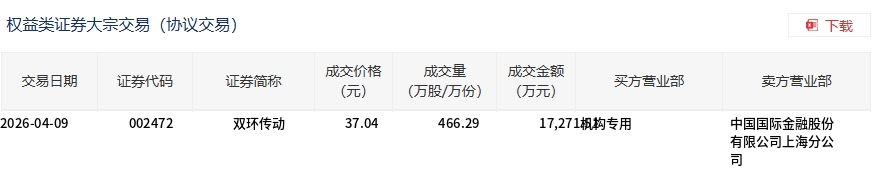 4月9日,双环传动大宗交易成交466.29万股,成交额1.73亿元,占当日总成交额的30.16%,成交价37.04元,较市场收盘价37.04元持平。