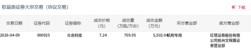 4月9日,众合科技大宗交易成交759.95万股,成交额5502.04万元,占当日总成交额的42.15%,成交价7.24元,较市场收盘价7.03元溢价2.99%。