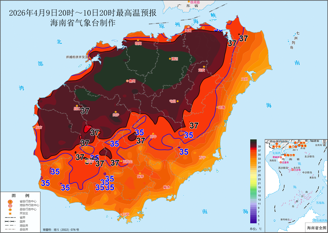 海南省气象局2026年04月09日16时20分继续发布高温三级预警:预计4月10日白天,海口、澄迈、临高、定安、屯昌、儋州、白沙、昌江和东方等9个市县的大部分乡镇将出现37摄氏度以上的高温天气,其中昌江、白沙、儋州、临高和澄迈部分乡镇气温可达40摄氏度以上,请有关单位做好防暑降温、森林防灭火等相关工作。