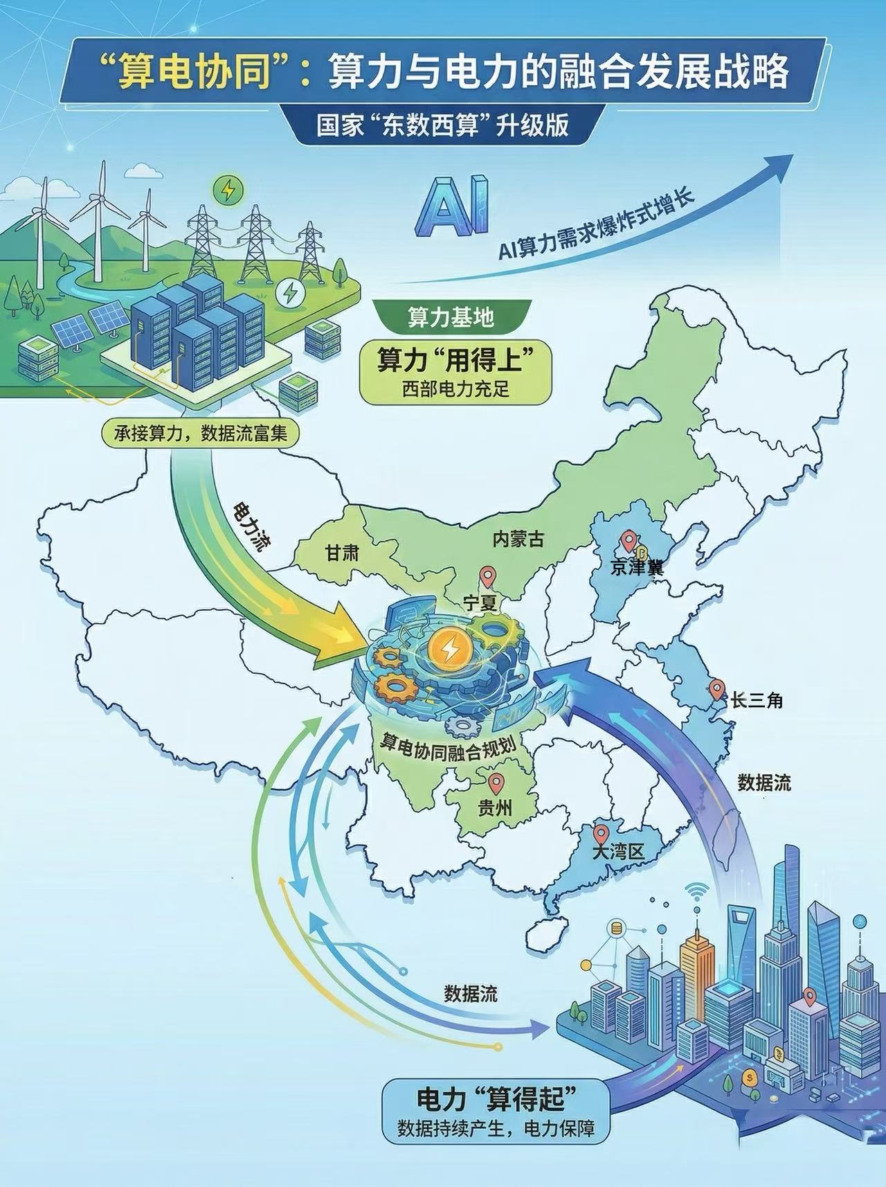 2021年,中国明确布局八个国家算力枢纽节点;2022年2月,“东数西算”工程全面启动;2026年,政府工作报告首次将“算电协同”纳入国家战略。