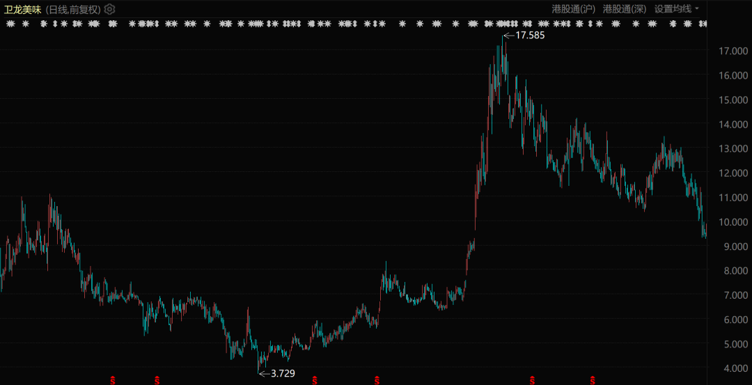 上市首日破发后,卫龙的股价便始终在低谷中挣扎。2024年其股价跌至4.199港元,市值较上市首日蒸发超百亿元;2025年虽短暂反弹至17港元的高点,但年报发布后又迅速跌回发行价之下。