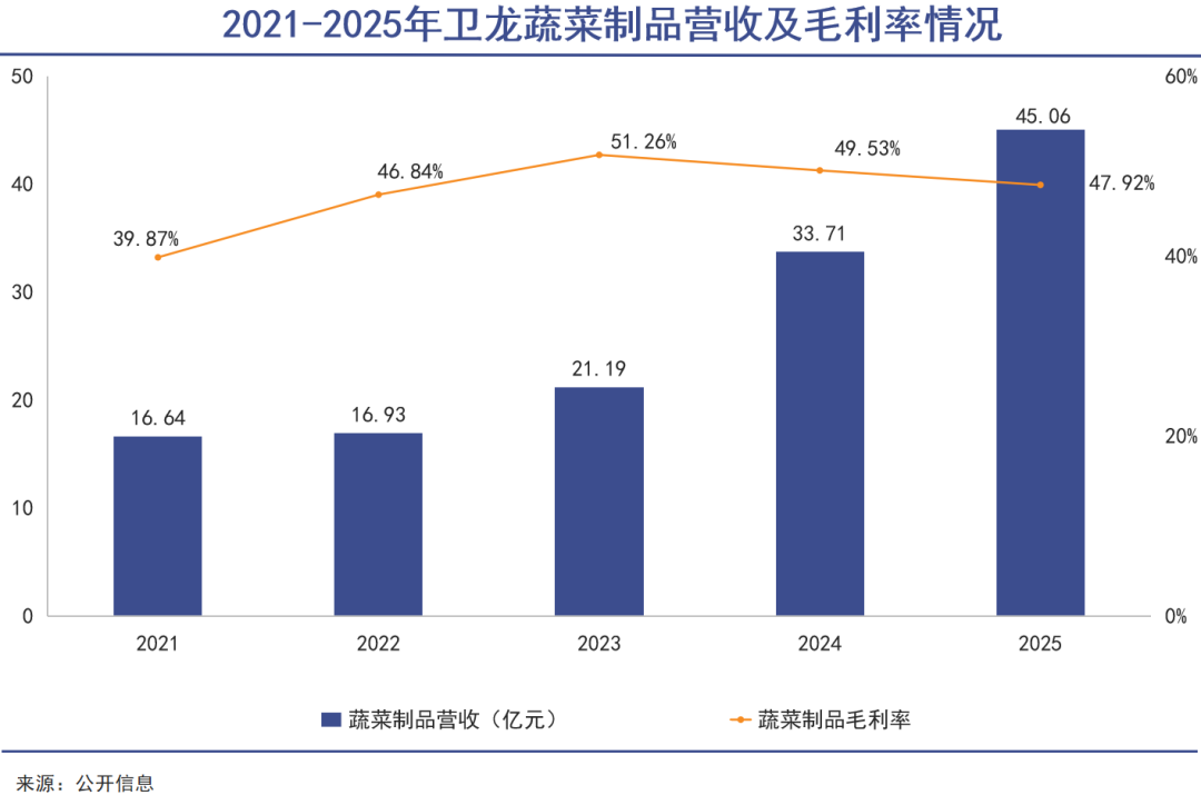 去年其蔬菜制品收入达到45.06亿元,同比大幅增长33.67%,占总营收的比重从2024年的53.79%,大幅跃升至62.38%,正式取代辣条,成为拉动公司增长的绝对主力。