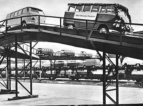 24个月后,一款内部代号为T1的、外形圆滚滚的第一辆平头厢式货车Transporter正式在位于西德狼堡总厂与甲壳虫共线生产。酷似面包车的Transporter充满着复古的Chic风味,圆润的车身线条,V字形前脸凸起区域,硕大的VW标志、前大灯和两块分别可独立开闭的前风挡。即便放在当下,这台T1依旧比市面上在售的大部分车型优雅复古,不信你拿下面这张图给你女友/老婆看,问问她是愿意和T1自拍还是愿意和你们家的私家车合影。