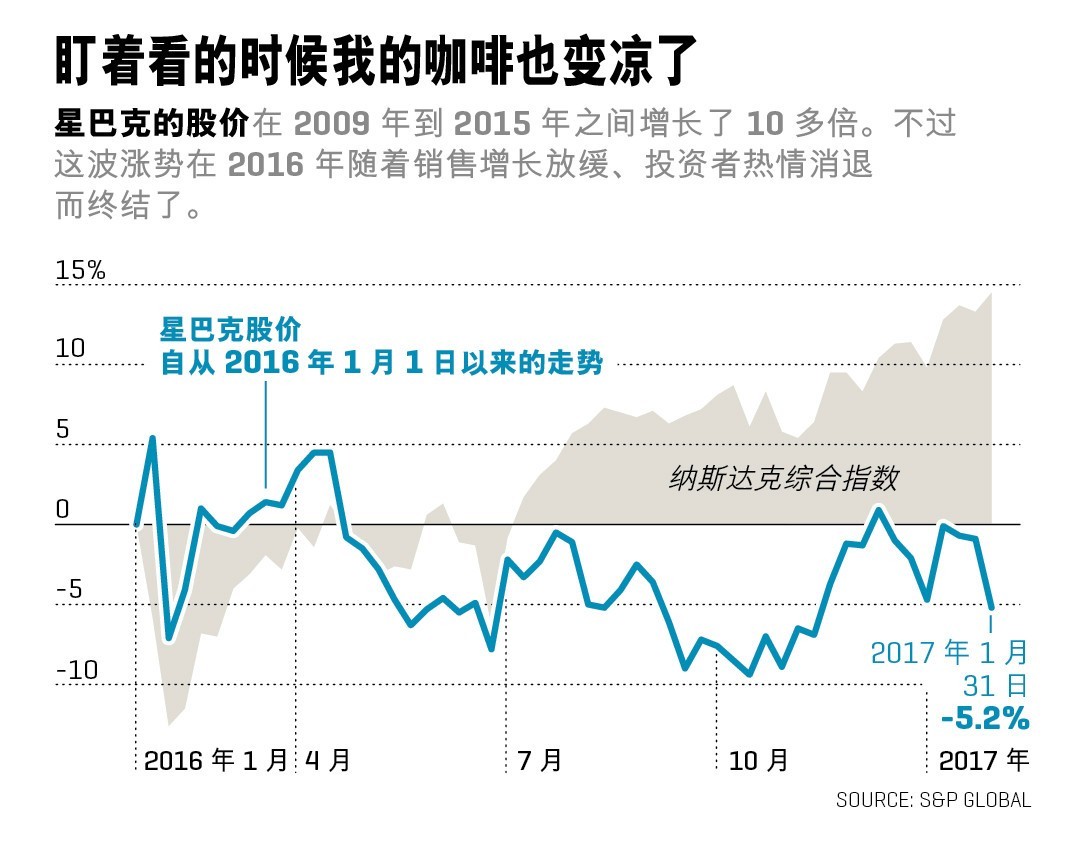 就连舒尔茨本人也说,星巴克的股票走势有些不稳。从2009年起到2015年,公司的股价增长了1,170%,而在2016年则跌去了8%,这是自从2008年以来的首次下跌—尽管大盘上涨了10%。令人沮丧的是,下跌竟然找不到很明确的原因。有些怀疑指向了销售增长放缓、舒尔茨(第二次)宣布从首席执行官的位置上退休后领导层的不确定性、甚或是这家总部位于西雅图的公司制定了依靠海外市场的发展计划,而特朗普执政后给跨国经营带来了不确定因素。
