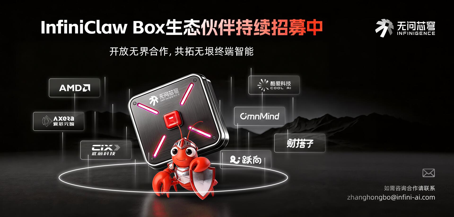 目前,InfiniClaw Box 已与爱芯元智等伙伴在端侧芯片优化与龙虾盒子等方面展开深度合作,未来还将进一步打通适配更多端侧芯片,持续探索本地龙虾在国产端侧芯片应用上的更多可能性。