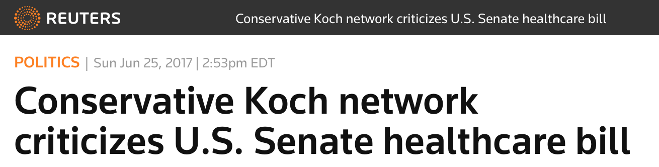 由科赫兄弟支持的草根倡导团体Americans for Prosperity主席菲利普斯(Tim Phillips)说,新的提案对于推翻奥巴马医保法案还不够彻底,他们正赶在投票之前努力游说以修改提案。
