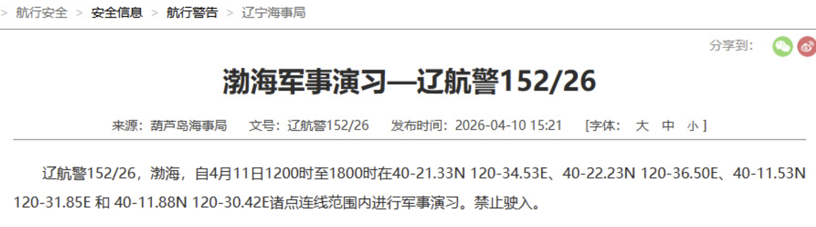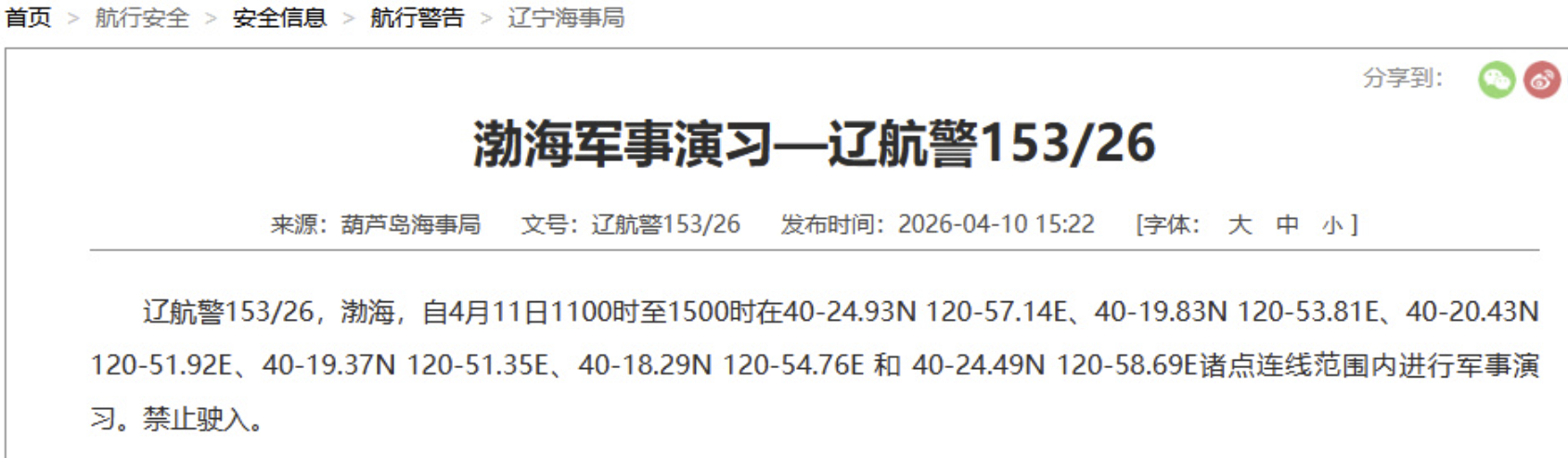 据中国海事局网站消息,葫芦岛海事局发布航行警告,4月11日11时至15时,4月11日12时至18时,渤海部分海域进行军事演习,禁止驶入。