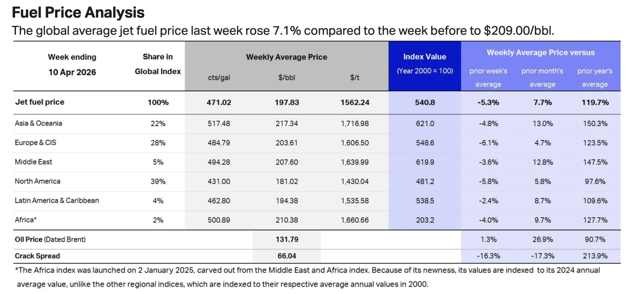 截至4月10日,国际航油均价已逼近198美元/桶,较一个月175美元/桶高位,再次上涨13%。其中,亚洲是全球航油最贵区域,均价高达217美元/桶。尽管上周受停战消息影响,环比有所回落,但同比去年涨幅已超150%,始终在高位震荡。