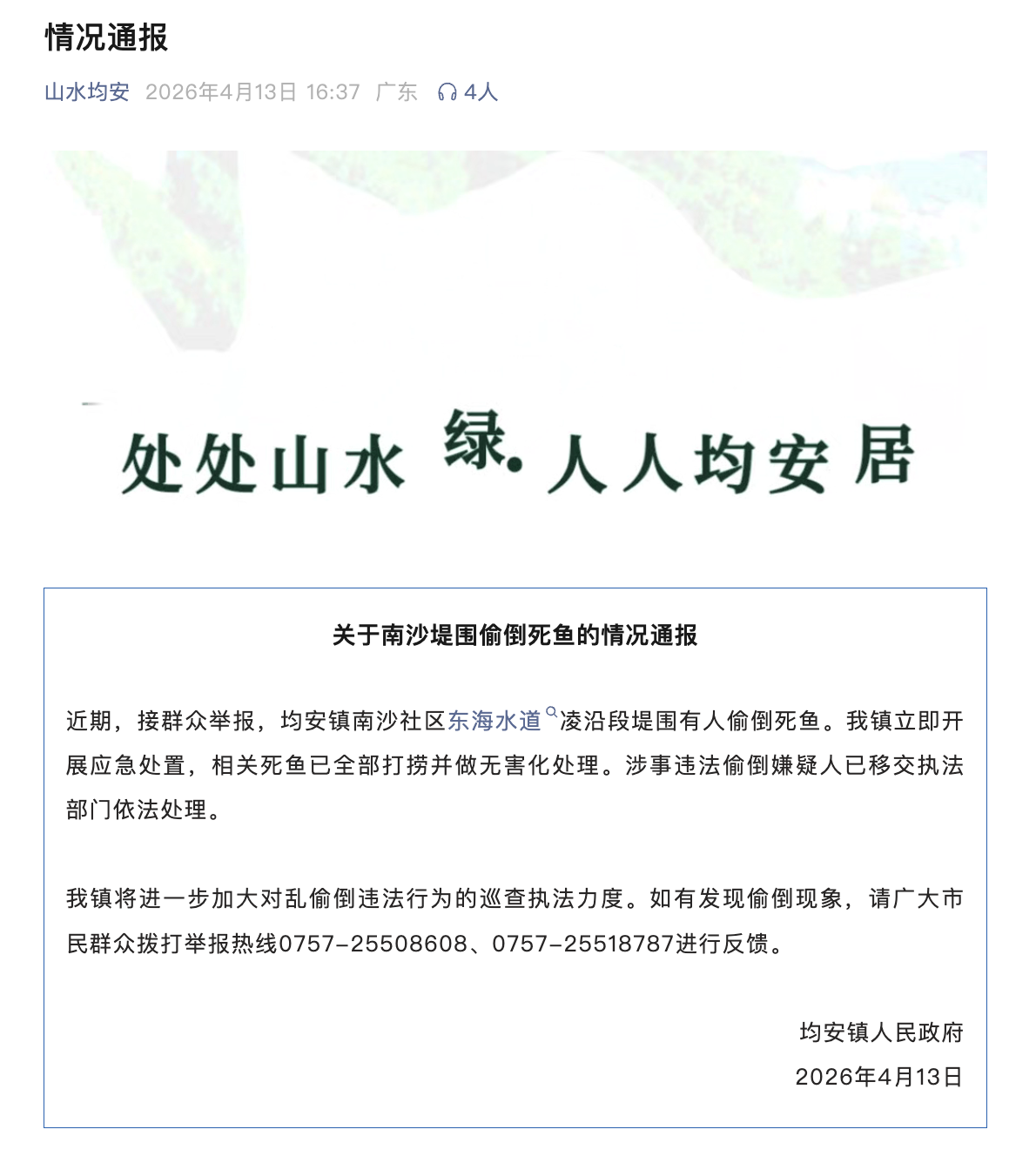 佛山市顺德区均安镇人民政府4月13日发布通报:近期,接群众举报,均安镇南沙社区东海水道凌沿段堤围有人偷倒死鱼。我镇立即开展应急处置,相关死鱼已全部打捞并做无害化处理。涉事违法偷倒嫌疑人已移交执法部门依法处理。