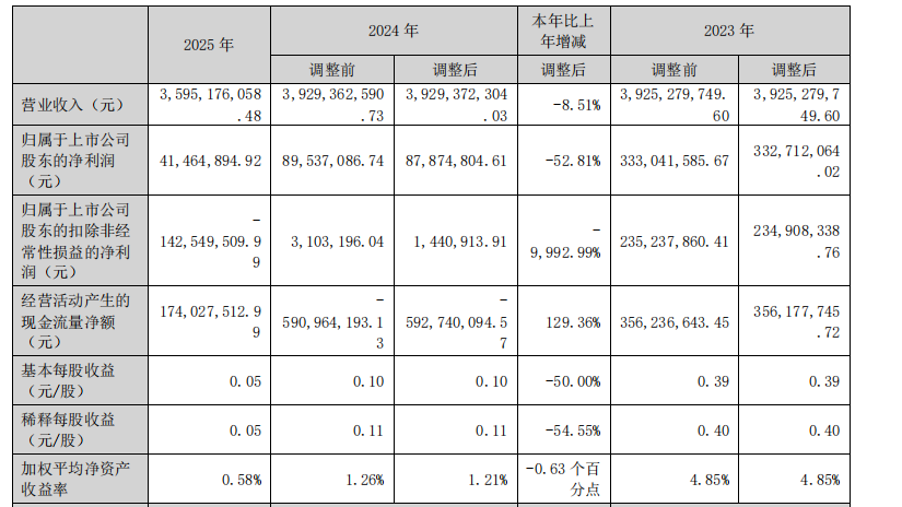 年报显示,2025年泰和新材实现营业总收入35.95亿元,同比下降8.51%;归属于上市公司股东的净利润4146.49万元,同比下降52.81%;扣除非经常性损益后的净利润为-1.43亿元,由盈转亏。