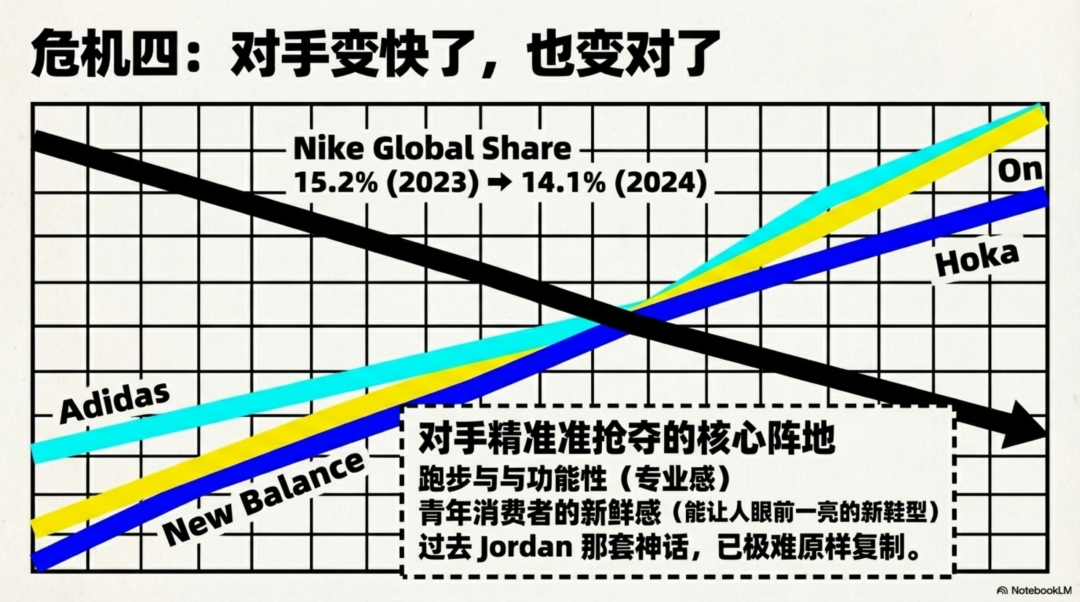 更麻烦的是,它们抢走的,恰恰是耐克最该守住的地方:跑步、功能性、专业感、以及年轻消费者对“新鲜感”的期待。
