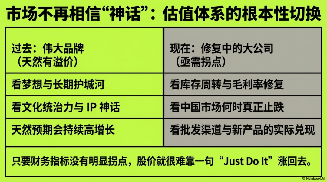 问题在于,资本市场以前愿意为耐克的传奇预付钱;现在,它只愿意为耐克的兑现买单。