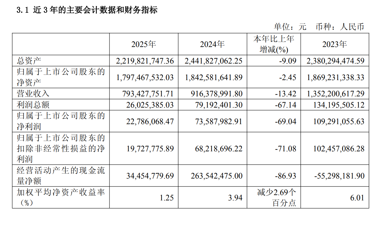 近日,华丰动力股份有限公司(股票代码:605100.SH)披露了《华丰动力股份有限公司2025年年度报告》。据该年报显示,2025年度公司实现营业收入7.93亿元,较上年同期的9.16亿元减少1.23亿元,同比下降13.42%。归属于上市公司股东的净利润为2278.61万元,较上年同期的7363.27万元减少5084.66万元,同比下降69.04%。扣除非经常性损益的净利润为1972.78万元,较上年同期的6827.90万元减少4855.12万元,同比下降71.08%。