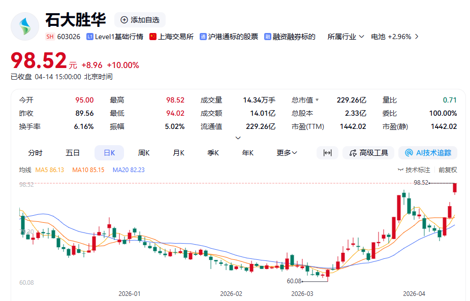 股价方面,4月14日,石大胜华开盘迅速上涨,并“10cm”封板涨停,截至收盘报收于98.52元/股。此前两个交易日(4月10日、4月13日),公司股价分别上涨10%、5.17%。