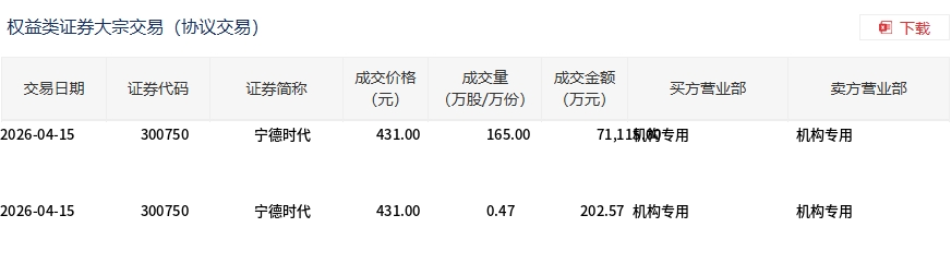 4月15日,宁德时代大宗交易成交165.47万股,成交额7.13亿元,占当日总成交额的4.24%,成交价431元,较市场收盘价431元持平。