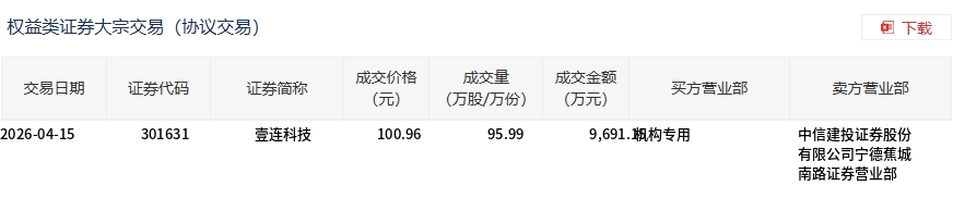4月15日,壹连科技大宗交易成交95.99万股,成交额9691.15万元,占当日总成交额的14.67%,成交价100.96元,较市场收盘价102.99元折价1.97%。