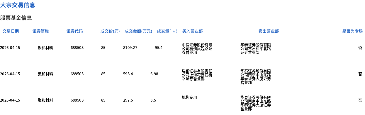 4月15日,聚和材料大宗交易成交105.88万股,成交额9000.17万元,占当日总成交额的7.24%,成交价85元,较市场收盘价92.49元折价8.1%。
