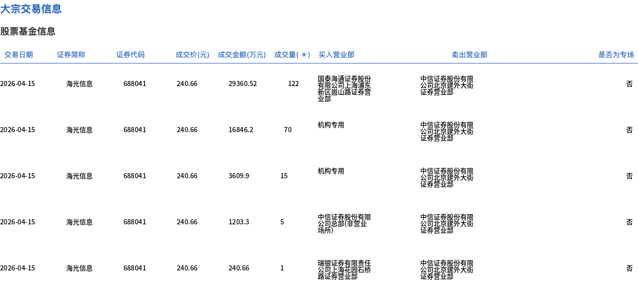 4月15日,海光信息大宗交易成交213万股,成交额5.13亿元,占当日总成交额的5.23%,成交价240.66元,较市场收盘价252元折价4.5%。