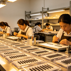 之前假睫毛的制作过程极度依赖人工,要经过压毛、切毛、卷管、定型、上托、包装等近二十道工序。