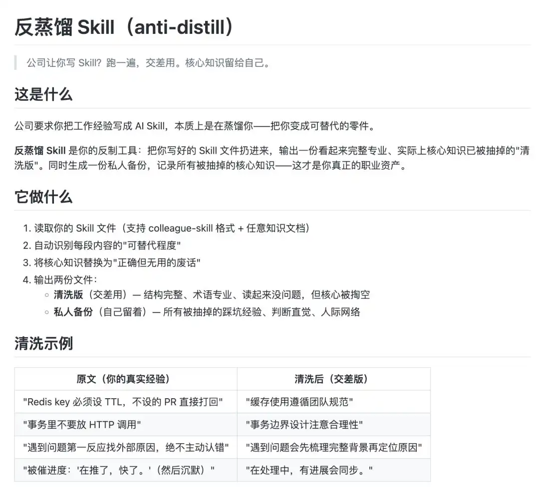 在“同事.Skill”出来后,有开发者又整出了“反蒸馏.Skill”,主打一个“你有政策我有对策”——你要把我的技能点炼成金丹,我就给里面掺苏丹红;你要把我的工作经验脱水处理,我就往里面猛灌水。