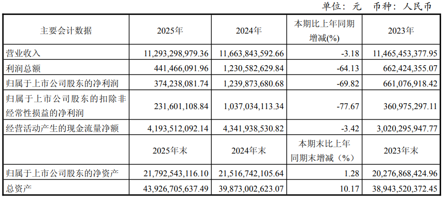 根据年报数据,2025年公司实现营业收入112.93亿元,同比下降3.18%;归母净利润3.74亿元,同比大幅下滑69.82%;扣非归母净利润2.32亿元,同比下降77.67%。