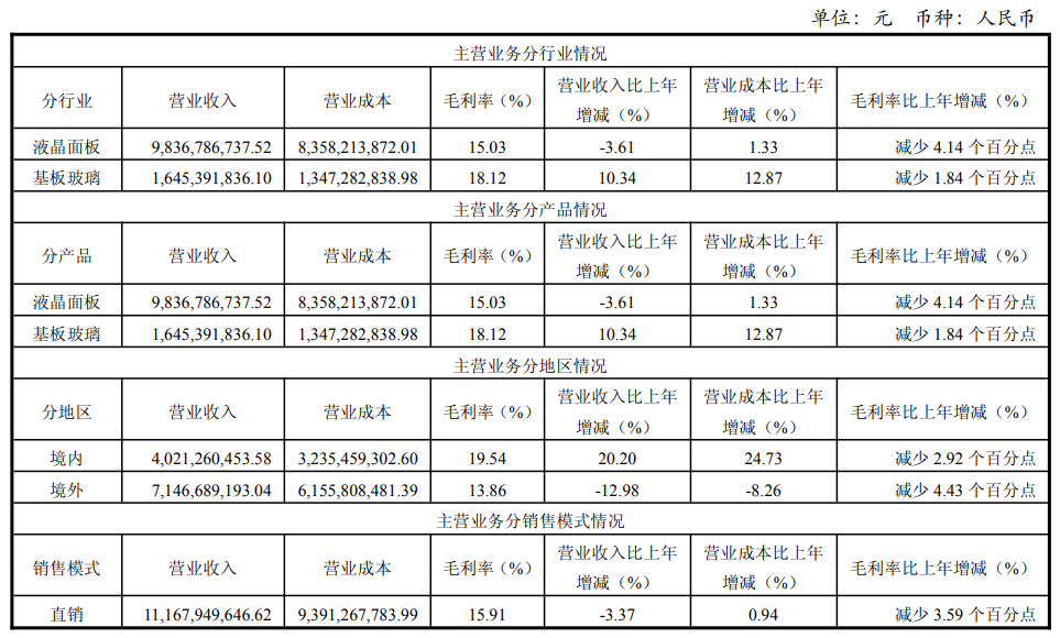 液晶面板业务,根据年报合并报表口径,2025年实现收入99.32亿元,同比下降3.49%,占总营收比重达87.95%,仍是公司营收的核心支柱;基板玻璃业务2025年实现收入16.77亿元,同比增长10.99%,成为全年业绩最大亮点(与总营收112.93亿元的差额,为内部交易抵消+口径差异)。