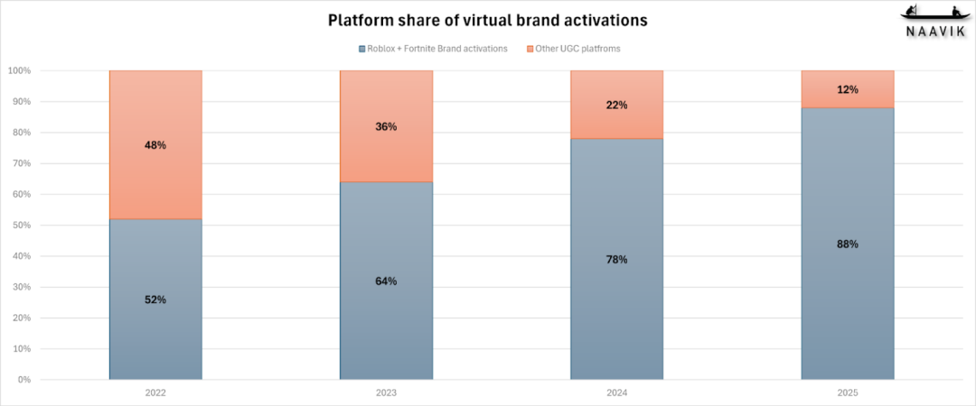 根据Naavik统计,在品牌投放层面,《Roblox》与《堡垒之夜》合计占据约88%的市场份额。