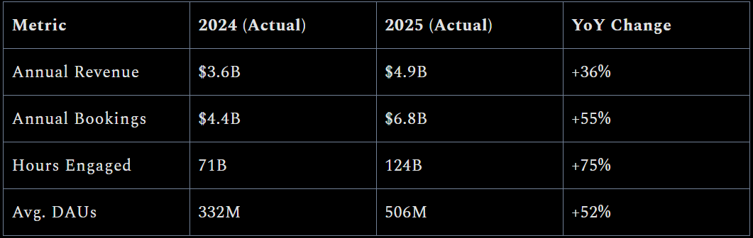 2025年,根据Naavik收集统计数据,仅头部UGC平台向创作者分成的金额就已达到约22亿美元,同比增长47%;其中,《Roblox》单一平台的年收入接近49亿美元,预订收入达到68亿美元。