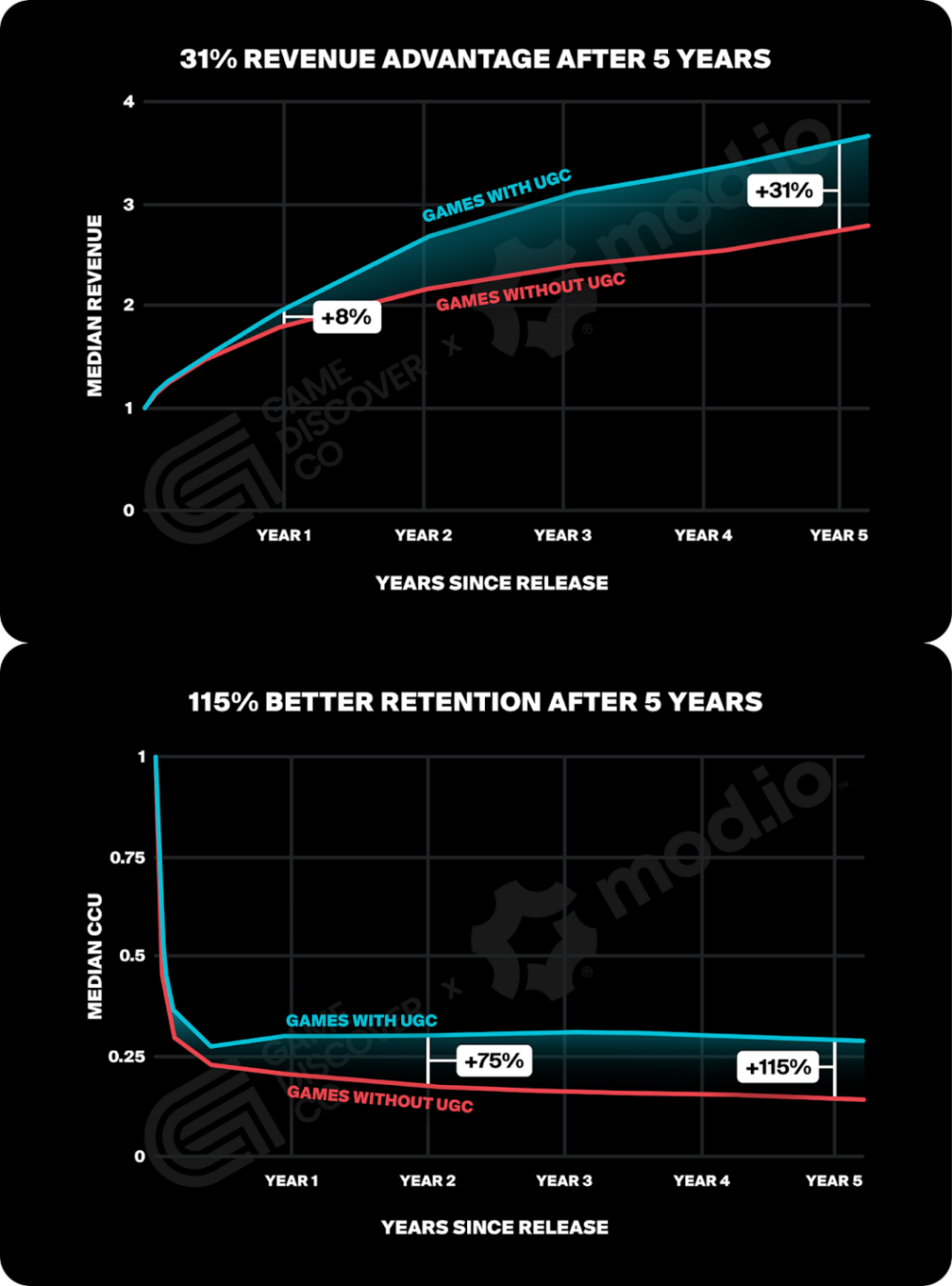 根据Mod.io的报告,支持UGC或Mod的游戏,在生命周期表现上显著优于未支持UGC的产品: