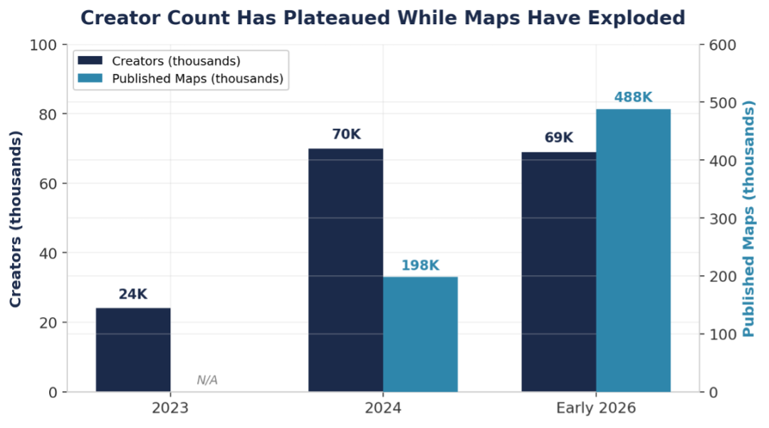 根据Chartis.gg数据,截至2025年,《堡垒之夜》创作者数量基本稳定在约7万人,但地图数量从19.8万增长至48.8万,增长超过2.5倍。