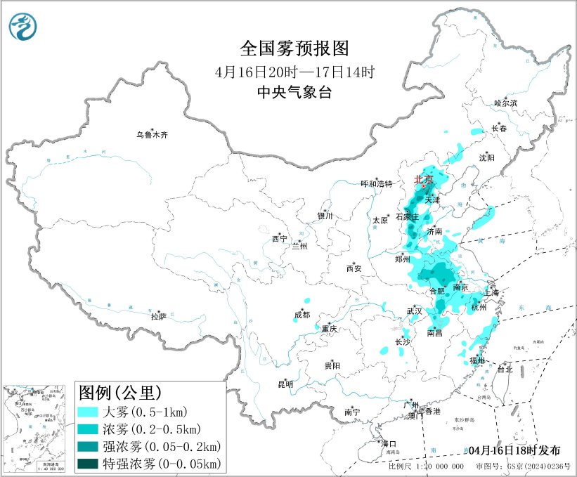 中央气象台4月16日18时发布大雾黄色预警:
